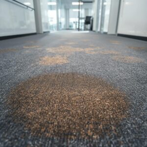 オフィスで頻繁に利用される休憩スペースやデスク周辺は、飲み物や食べ物をこぼした際のシミが残りやすい場所です。特にコーヒーや油分を含んだ食品は、繰り返し染み込むことで頑固な黒ずみを形成します。通路や執務エリアでも、スタッフが足を頻繁に運ぶ場所が「けもの道」と呼ばれ、継続的に汚れが蓄積しやすいです。これらを抑えるには、こまめな掃除と早めのシミ取り対策が重要となります。